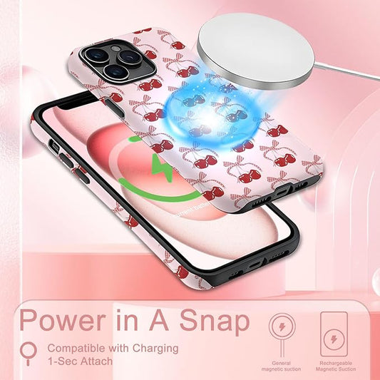 Compatible with Phone Protective Case, Pink Cherry Bowknot Floral Polka Dot Lace Aide Beautiful Girl Design [Compatible with Magasfe] Shockproof Soft TPU and Hard Shell Protective Cute Phone Case