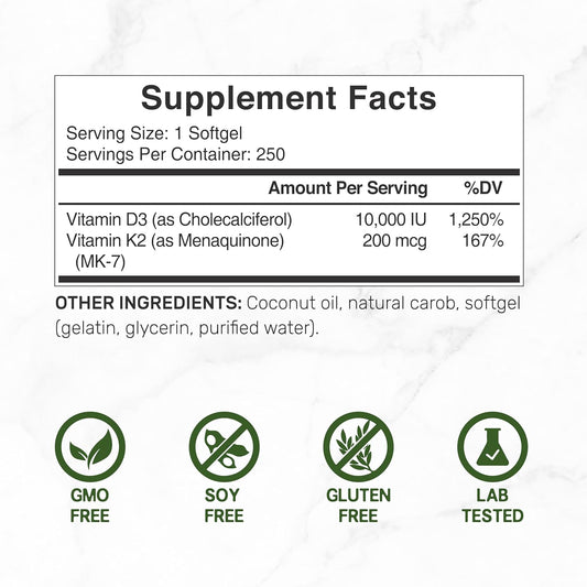 DEAL SUPPLEMENT Vitamin D3 10,000 IU + K2 MK7 200mcg Softgels, 250 Count | 2-in-1 Complex with Virgin Coconut Oil | Supports Heart, Bone, Teeth & Immune Health* | Easy to Swallow