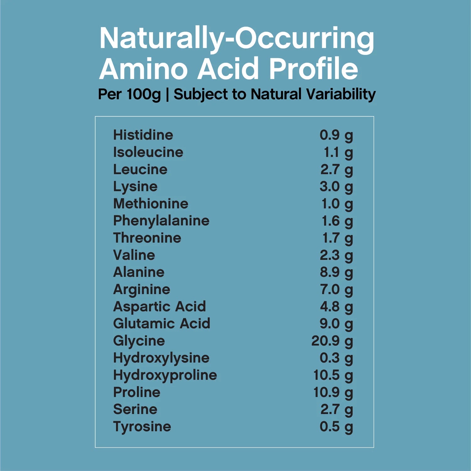 18 essential & non-essential amino acids, including Glycine, Proline, Hydroxyproline & Leucine