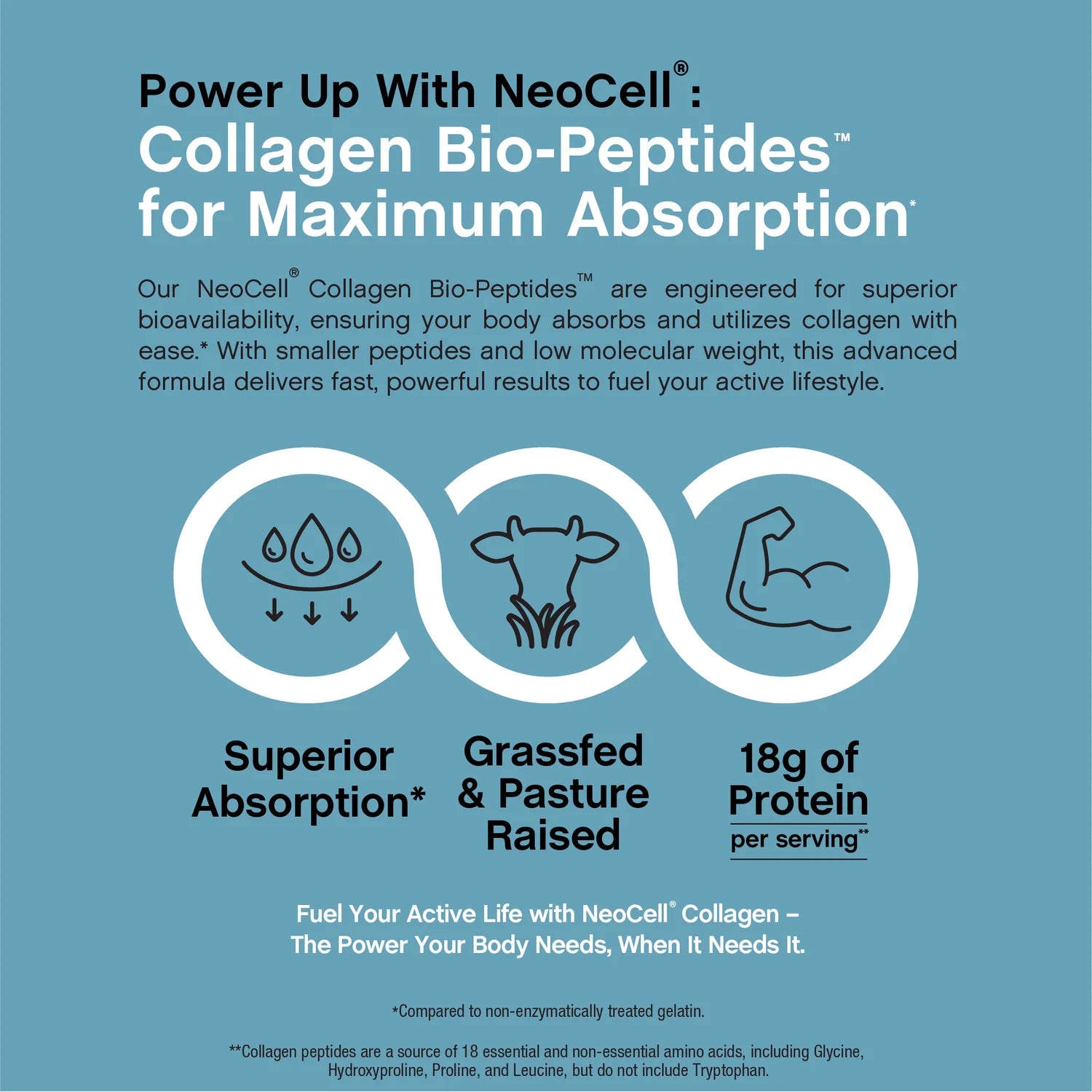 One serving of NeoCell® Collagen Bio-Peptides™ Protein delivers a full 20 grams of BioActive collagen peptides to help you feel and see the benefits.